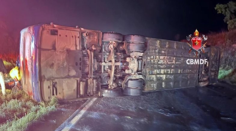 Um grave acidente foi registrado na noite deste domingo (23/11) na BR-020, cerca de 10 km após Planaltina, sentido Formosa (GO). Um ônibus de viagem que seguia para o Piauí capotou após colidir com um caminhão-guincho que removia outro veículo acidentado mais cedo — um caminhão carregado de arroz que havia tombado na mesma rodovia.
