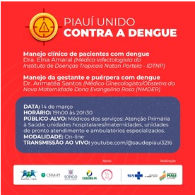 A Secretaria de Saúde do Piauí (Sesapi) realiza, nesta quinta-feira (14), um treinamento na modalidade on-line para médicos que atuam nos serviços da Atenção Primária à Saúde, Unidades Hospitalares/Maternidades, Unidades de Pronto Atendimento, Ambulatórios Especializados em relação ao manejo de pacientes com dengue. A transmissão do evento vai ocorrer no link https://www.youtube.com/@saudepiaui3216 a partir das 19h.